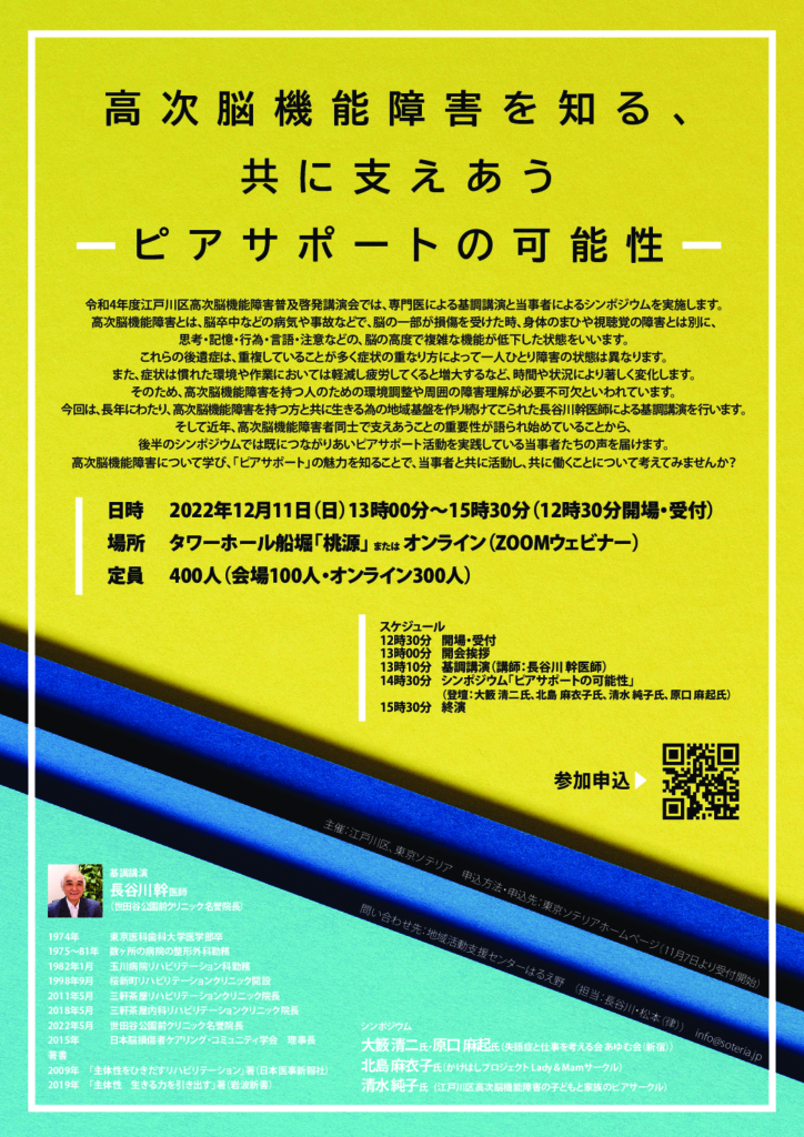 高次脳機能障害を知る、共に支え合う-ピアサポートの可能性-と題した講演会があります。長谷川先生による基調講演後、シンポジストとして登壇します。今回は、かけはしプロジェクトで自主運営している「オンラインサークル=ピアサークル」の重要性につい... -