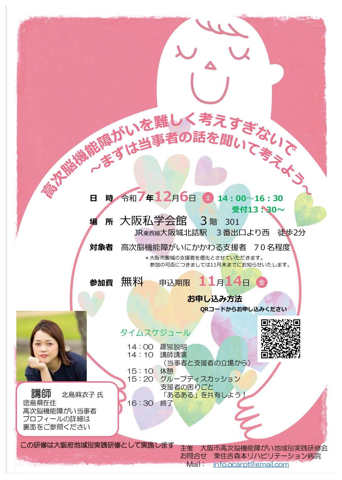 質問などありましたら事前のアンケートに記入頂けたらと思います。R7.12.6大阪府地域別実践研修高次脳機能障がい研修会チラシ