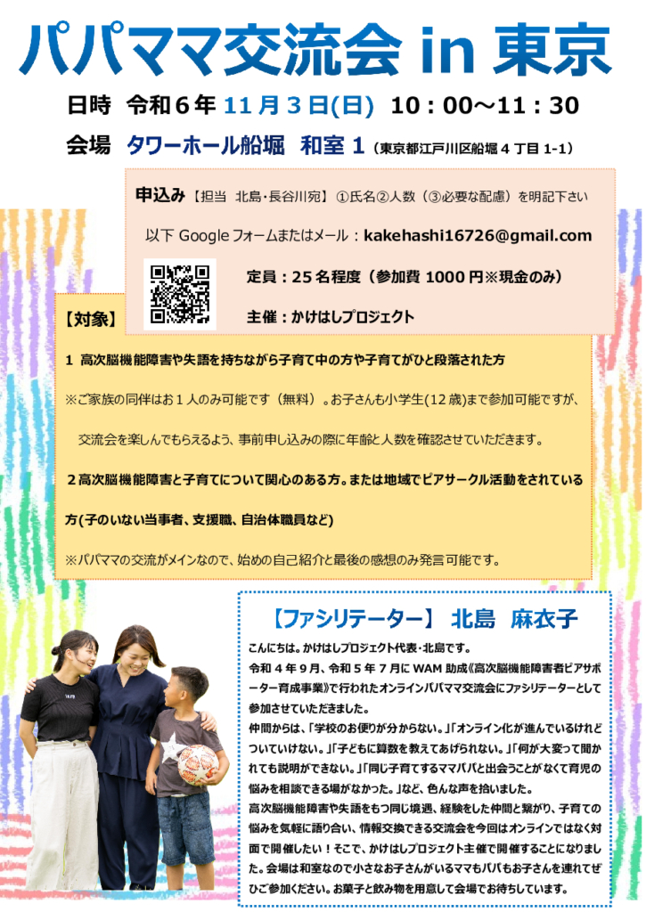 こんにちは。かけはしプロジェクト代表北島です🌈11/3(日)10時~11時30分【高次脳機能障がい・失語症のあるパパママ交流会】開催の再案内です。チラシにも記載していますが、当事者だけでなく支援職の方の参加も募集しています。当事者の困りごとの... -