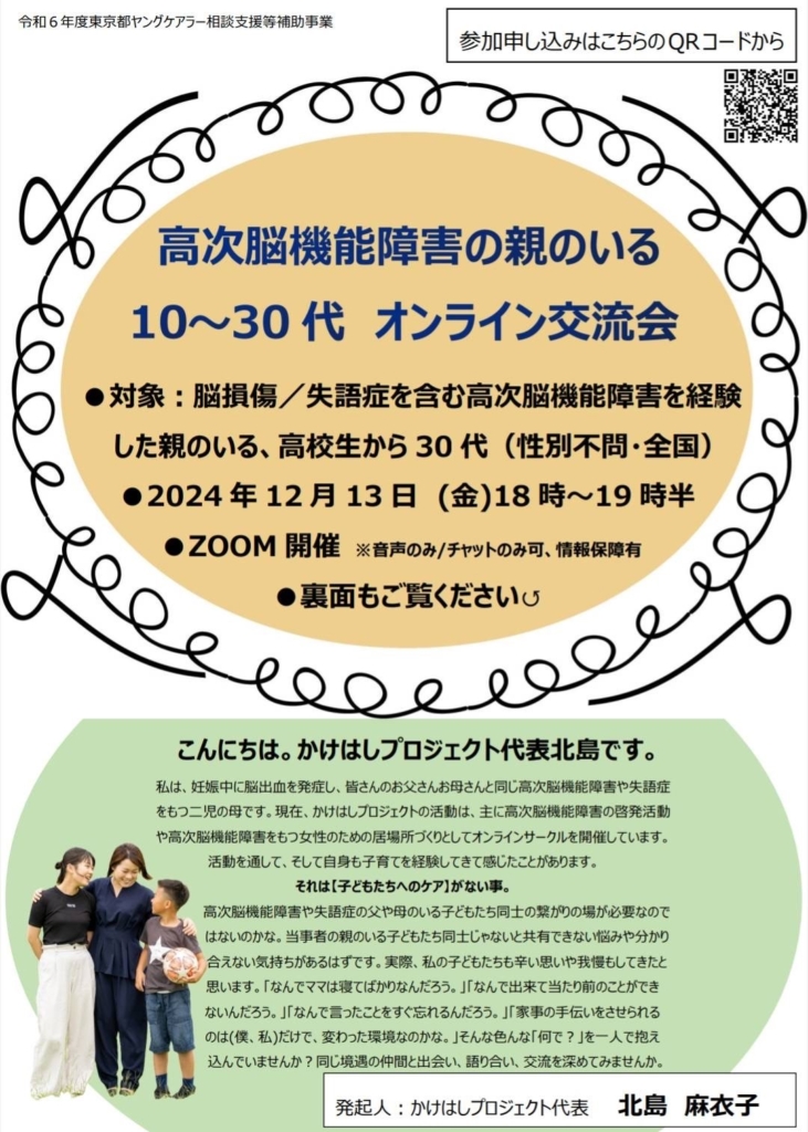 こんばんは。かけはしプロジェクト代表北島です。12月13日㈮18時~19時半オンライン開催で高次脳機能障害の親のいる子どもたちの交流会を開催いたします。全国から参加可能で、性別不問です。この交流会を開催しようと思った経緯は、自身も子育てを経験し... -