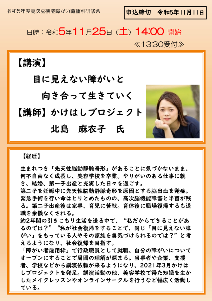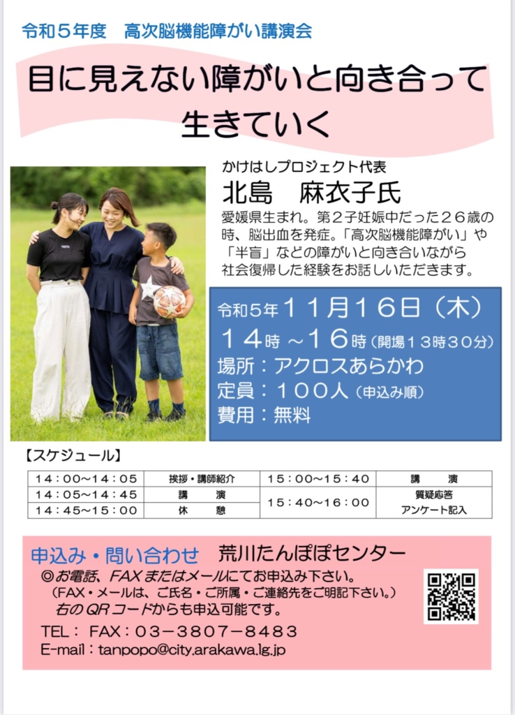 こんにちは!かけはしプロジェクト代表の北島です。講演会のご案内です🌈11月16日(木)荒川区にて【高次脳機能障がい講演会】にて講演させていただくことになりました。東京では、江戸川区で講演させていただいたことはありましたが荒川区は初めてで... -