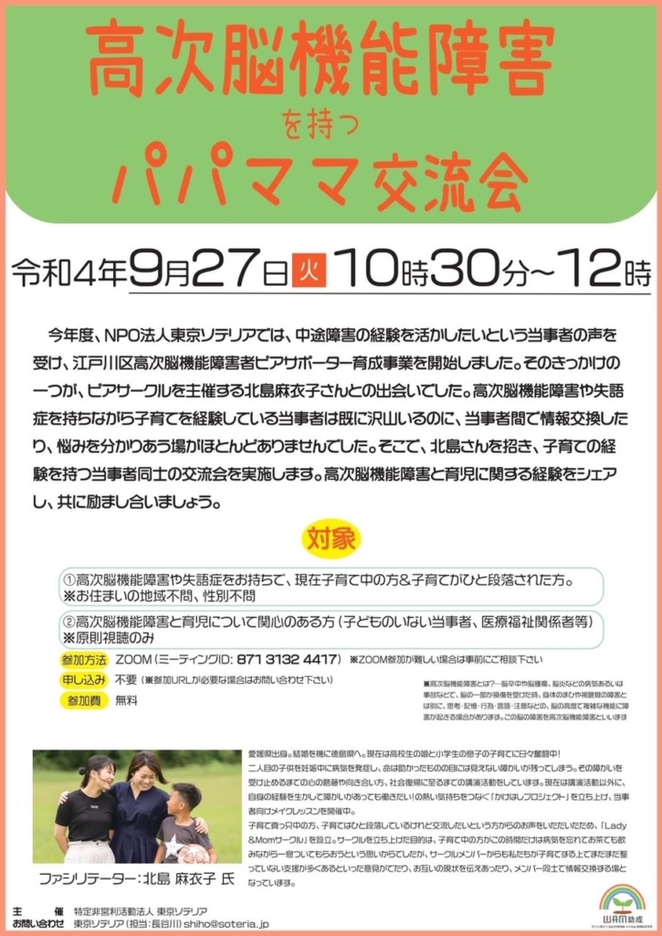 9月27日(火)10時30分から12時、高次脳機能障害を持つパパママ交流会が開催されます。以前、東京ソテリア様主催の講演会でその時は「就労」がテーマでした。今回は、子育て中のパパママとの交流会です!サークルへの参加は少し緊張するからやめて... -