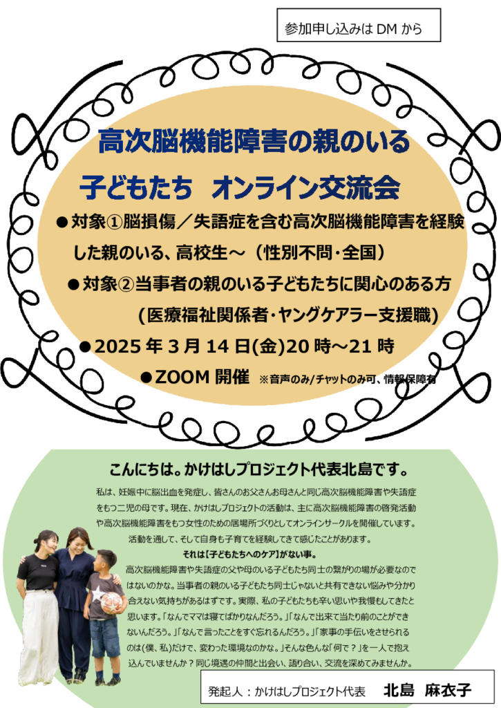 こんにちは。かけはしプロジェクト代表北島です。今月も、高次脳機能障害・失語症の親のいる子どもたちの交流会を開催します。詳しくはチラシをご覧ください。今回は、参加対象者の中に、医療関係者の方やヤングケアラー支援職の方(その他関心のある自治体... -