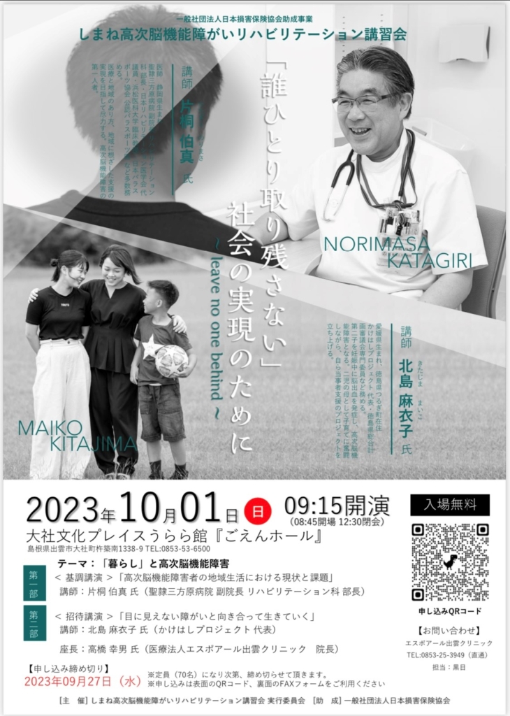 こんにちは🌈かけはしプロジェクト代表北島です。ご縁があり、10月に島根県高次脳機能障がいリハビリテーション講習会にて講演させていただくことになりました。チラシを添付いたしますのでそちらをご確認いただけたらと思います。お会いできること... -