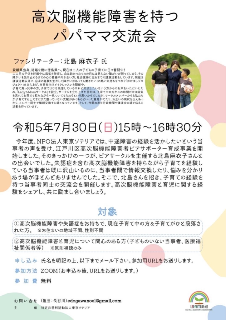 こんにちは。かけはしプロジェクト代表北島です。今年も高次脳機能障がいをもつパパママ交流会を開催します。東京ソテリアさん主催で、私はファシリテーターとして参加します。皆さんが、子育てする上で実際どんな困りごとを抱えてらっしゃるのか、どんな... -